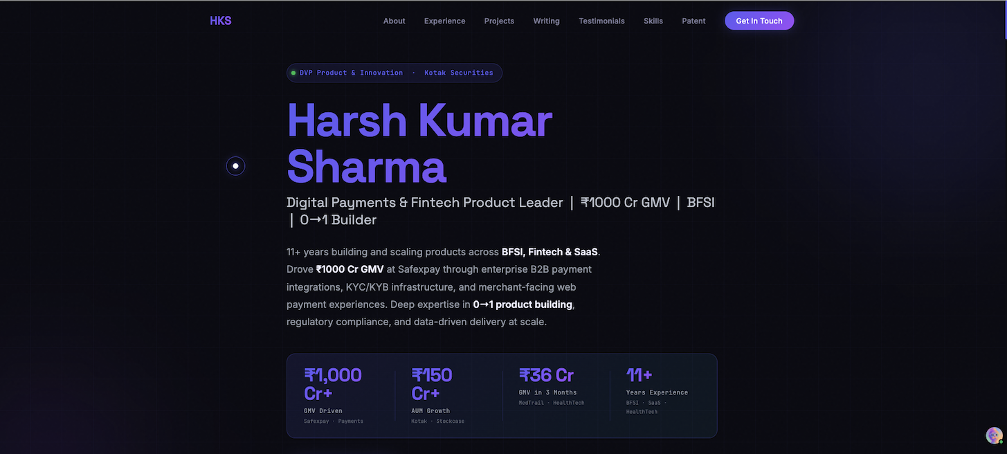 A bespoke personal-portfolio website designed and engineered for an individual founder — a single, fast-loading page that captures who they are, what they've shipped, and how to reach them.